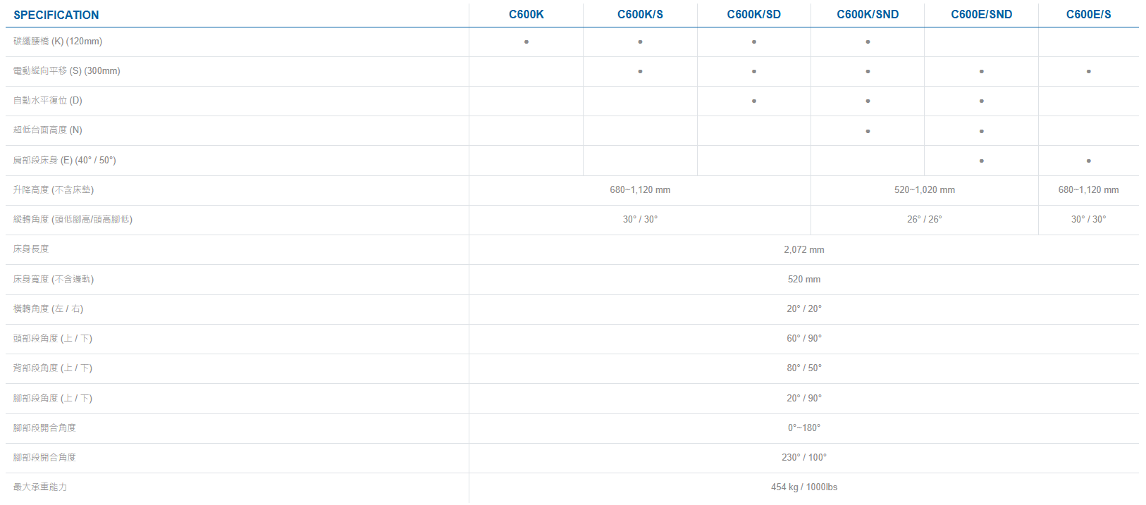 提供超低的台面高度、自動水平復位、自動水平位移等多種型號配置,適用於所有手術領域並滿足外科醫生的所有需求。C600 是一款功能齊全且久經考驗的多功能電動液壓手術台。產品優勢: