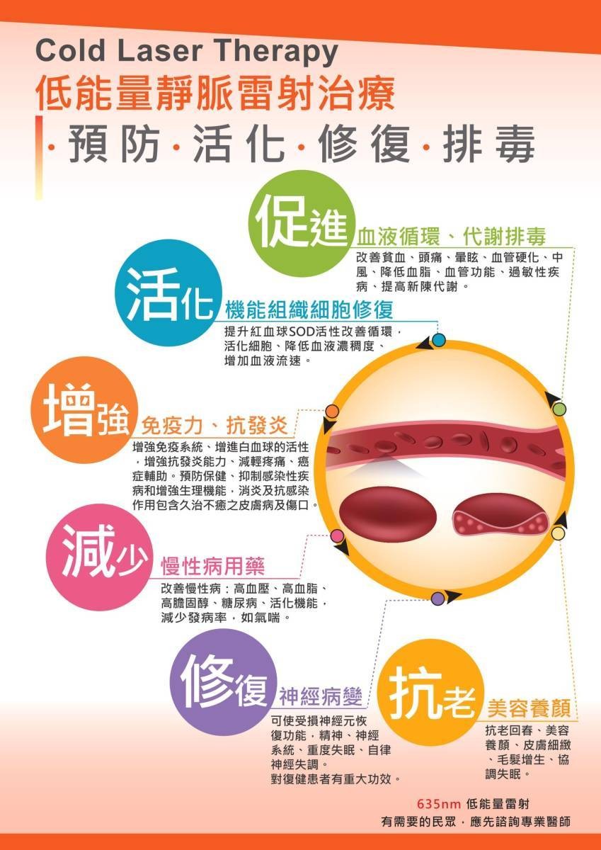 Q1:非侵入式氦氖波段低能量雷射會不會有副作用、傷害或應注意情況? 若對照光治療會過敏的人或凝血機能異常者、心臟節律器配戴者、懷孕者不建議,不可以直射眼球。 雷射是一種生物活化性雷射,照射後人體會增強自我修復能力及活化生理機能,與一般高能量雷射的生物破壞性雷射不同,因此幾乎沒有副作用。全世界有超過2000篇關於低功率雷射療法的研究報告,報告指出低功率雷射療法的有效性,並且沒有負面副作用的產生。 Q2: 非侵入式氦氖波段低能量雷射在臨床中有傷口癒合的治療嗎? 奇美醫院皮膚科主任賴豐傑表示,在臨床看診中,一般糖尿病患者如有傷口問題,除了勤於換藥、或是高壓氧治療之外,其實低能量雷射也是一項治療方式,且其治癒率頗高,如果是一般傷口,其治癒率約可高達9成。患者在治療過程中,需配戴護目鏡保護眼睛,照射不會有組織破壞具有安全性,也沒有一般雷射傷口需要照顧的疑慮,不會有色素沉澱。 取自 https://news.ltn.com.tw/news/life/paper/602178 Q3: 非侵入式氦氖波段低能量雷射如何可以加速傷口癒合? 雷射光對生物組織要產生效應,光被組織細胞內的色素基吸收。色素基是粒腺體中的細胞色素、脂質、和黃色蛋白質…等。這些色素基吸收光能後會改變粒線體中的氧化還原反應,刺激生物細胞並誘發或強化一些生理反應,其中包括有:促進局部的血液循環、調節細胞的功能、提升免疫機能,促進細胞代謝及增殖能力……等。藉由血球細胞粒線體進行光化學作用,讓生理產生變化來達到抗發炎、止痛、促進傷口癒合等治療目的。 Q4:非侵入式氦氖波段低能量雷射照射多久會有感覺(效果)? 治療效果是溫和漸進的,故效果會因人而異,如果治療後反應不明顯則表示症狀較嚴重,繼續治療效果就會慢慢出現。 以加速傷口癒合而言,大約連續照三次就可以感受到差別,以三高而言客觀做法是在療程前後做抽血檢查,以數據來進行對照,即可知道效果。 Q5:非侵入式氦氖波段低能量雷射照射進行時,可否飲食或喝水? 若需於當時飲食及喝水時,則可同時進行。 Q6 : 照射時間要多久?照射要連續可以暫停嗎? 相同位置,請依使用說明書照射時間,超過累積照射劑量達飽和度時,多照射無益。如暫停或中斷時,可以補足中斷後之剩餘照射時間。 Q7:容易操作嗎?照射時會有什麼感覺? 簡易操作面板,容易上手。不同於遠紅外線,低能量雷射為冷光,不會有熱的感覺也不會灼傷皮膚,傷口癒合之照射有時會有微微刺刺或癢癢的感覺,此為的正常現象。 Q8: 目前台灣醫療院所低能量雷射照射治療有那些? 皮膚潰瘍、帶狀皰疹後之神經痛、分節式白斑、禿髮症、其他皮膚疾病包括扁平苔癬、乾癬性關節炎、慢性疼痛、蟹足腫、硬皮症等。 各種急、慢性疼痛、肌腱、韌帶傷害、消除腫脹及發炎、加速傷口癒合、鼻過敏等、醫療器材為輔助治療,治療前必須接受合格專業醫師評估後接受低能量雷射治療。